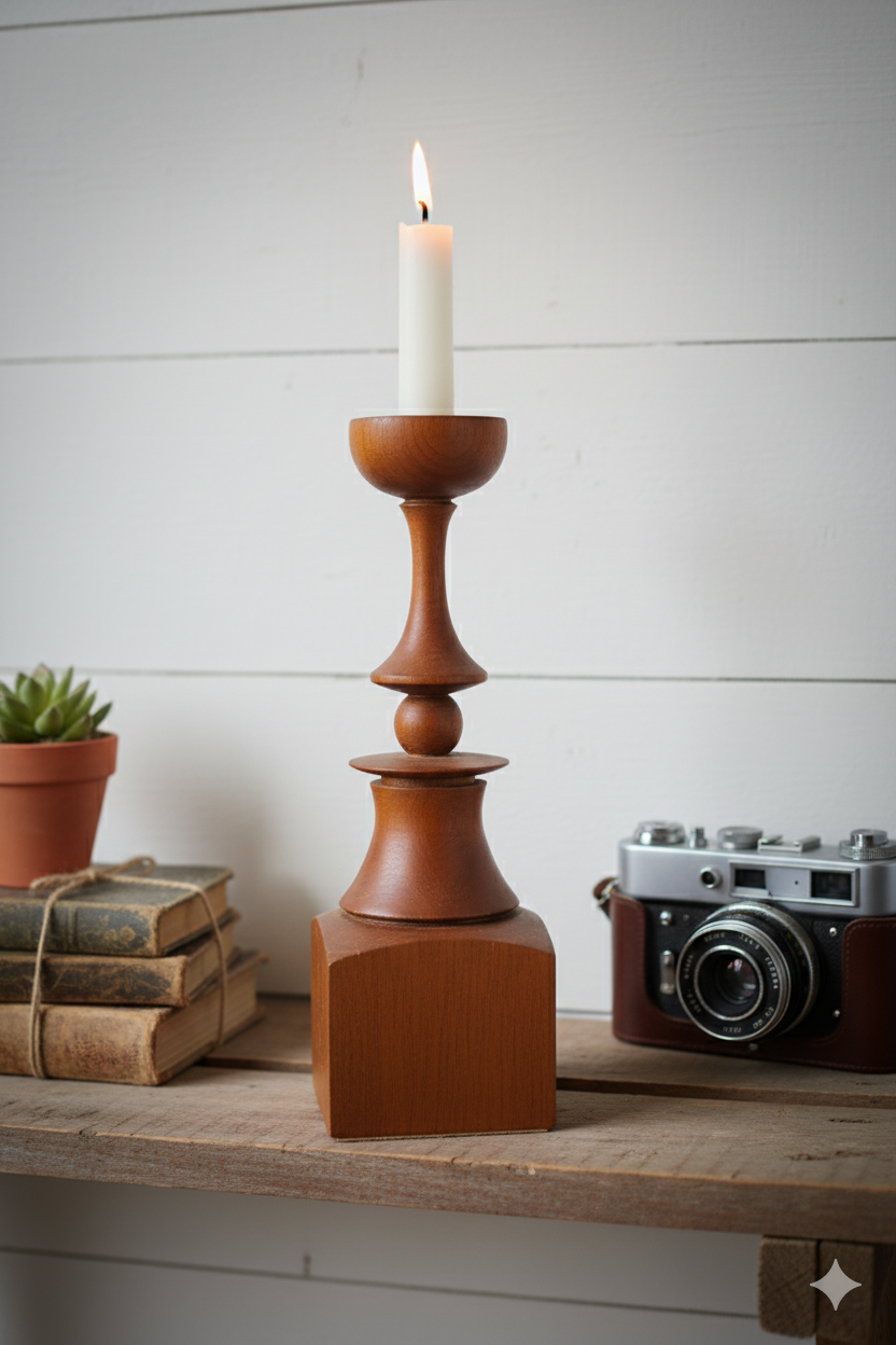Feito à mão em madeira torneada, este castiçal une simplicidade e beleza natural em cada detalhe.