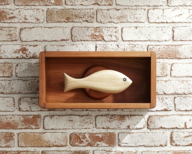 Um peixe de madeira, delicadamente esculpido à mão, flutua dentro de uma caixa também em madeira maciça. No fundo, um círculo representa o sol — símbolo da luz e do movimento da vida.